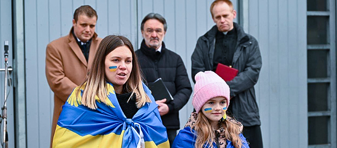 Auch Deutschland müsse wachsam und wehrhaft sein - und der Ukraine weiter beistehen. "Und wir müssen auch im Inneren unseres Landes den gesellschaftlichen Zusammenhalt wahren und jenen entgegentreten, die sehr zur Freude Putins unsere Gesellschaft destabilisieren und Europa auseinanderbringen wollen," sagte Tschesnok. Die Performance der Kinder und Jugendlichen aus der Ukraine war organisiert worden vom Verein "People for People", der sich mit Hilfstransporten und anderen Aktionen für die vom Krieg betroffenen Menschen in diesem Land engagiert. Zum Abschluss sprachen Pfarrer Jürgen Gossler von der evangelischen Kirchengemeinde Hünfeld und Pater Superior Norbert Wilczek OMI vom Hünfelder Bonifatius Kloster ein Friedengebet. "Da hilft nur noch beten, meine mancher", sagte Pfarrer Gossler, beten helfe aber nur dann, wenn wir täten, was dem Frieden diene. Auch Pater Wilczek betete deshalb darum, den Menschen Gottes Kraft zum Frieden zu geben. Auch in Fulda, Marburg, Limburg, Kassel oder Darmstadt fanden Kundgebungen statt. +++ pm/hk