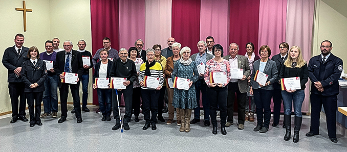 In den vergangenen zwei Jahren hatten sich zahlreiche Ehrungen angesammelt. Für 15 Jahre Mitgliedschaft wurden geehrt: Theresa Fey (aktiv), Petra Klee (aktiv), Verena Sauer (aktiv), Sabrina Abel, Wilfried Abel, Paul-Erich Fink, Holm Müller, Hermann-Josef Scheich, Rosemarie Steinwachs, Matthias Hohmann. Für 25 Jahre: Elisabeth Abel, Karl-August Arnold, Siegfried Böpple, Erhard Henkel, Raimar Hohmann, Thomas Hohmann, Annemarie Jost, Winfried Möller, Albert Peter, Josef Preis, Markus Schäfer, Nicole Schmidt, Leonhard Schreiber, Jürgen Süssemilch, Annika Gerhardt, Jürgen Giebel, Dominic Hohmann, Patricia Koch und Carlo Steinhauer. Für 40 Jahre Mitgliedschaft: Adelhard Biel, Gerhard Bleuel, Reinhold Busold, Ulrike Freidhof, Hermann-Josef Hohmann, Josef Hohmann, Stefan Hohmann, Klaus-Peter Jung, Achim Löwenthal, Ortrud Nophut, Arnold Plauschinat, Bernhard Preis, Anita Richter, Werner Richter, Alfred Steinwachs, Alfred Vogt, Heike Abel (aktiv), Tanja Hohmann, Renate Ludwig, Mathias Vogt. Und für 50 Jahre: Ernst Füzy, Holger Vogt, Marlene Bott. Herzlichen Glückwunsch an alle Geehrten! +++ pm