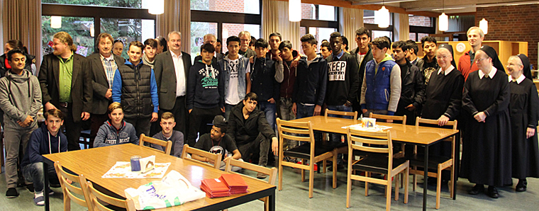 Nach der offiziellen Begrüßung durch Caritasdirektor Juch wandte sich auch Generalvikar Stanke mit einer kleinen Ansprache an die Jugendlichen aus Eritrea, Syrien, Afghanistan, Gambia und Albanien. Er wünschte ihnen, dass sie sich in dem Haus wohl und geborgen fühlen, rasch Deutsch lernten, eine Ausbildung machen und dadurch ihren Platz in der Gesellschaft Deutschlands finden können. An die Schwestern, aber insbesondere auch an das Caritas-Team richtete Stanke seinen Dank, dass sie diese Betreuung der jungen Flüchtlinge in so guter Atmosphäre ermöglichen. Als Geschenk überreichte er jedem der Jugendlichen einen Buchgutschein, so dass sie nach eigenem Gusto für sich Literatur auswählen können.