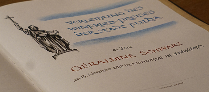 Ihr Werk führe authentisch vor Augen, dass eine gelebte Kultur der Vergangenheitsaufarbeitung der Schlüssel zur Gestaltung einer von Frieden und Freiheit geprägten, offenen Gesellschaft in Gegenwart und Zukunft sein könne, hieß es in der Begründung für die Verleihung. Für die Stadt Fulda und die Dr.-H.-G.-Waider-Stiftung ist es die 19. Preisverleihung. Der Preis ist mit 10.000 Euro dotiert und ging in der Vergangenheit an Persönlichkeiten wie EU-Kommissionspräsident Jean-Claude Juncker oder Kardinal Karl Lehmann († 11. März 2018 in Mainz). In der Geschichte des Winfried-Preises ist Géraldine Schwarz bisher die jüngste Preisträgerin. 1974 als Tochter einer französischen Mutter und eines deutschen Vaters in Straßburg geboren, arbeitete Géraldine Schwarz als Korrespondentin der Nachrichtenagentur AFP in Paris. Darüber hinaus arbeitete Schwarz als Autorin und Dokumentarfilmerin. Sie selbst bezeichnet sich als „Kind Europas“. Für ihr Buch „Die Gedächtnislosen“ wurde sie im vergangenen Jahr mit dem „Europäischen Buchpreis“ ausgezeichnet.