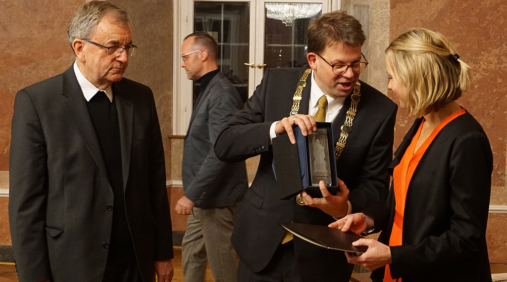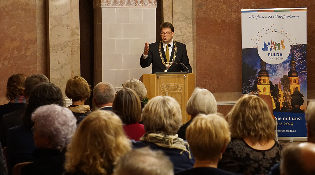 Vor dem Hintergrund des diesjährigen Stadtjubiläums (1275 Jahre Klostergründung Fulda) sagte Fuldas Oberbürgermeister, Dr. Heiko Wingenfeld, dass der Apell, der mit dem Winfried-Preis verbunden sei, nämlich stehend „für ein gemeinsames Europa“, in beängstigender Weise von Jahr zu Jahr aktueller zu werden scheine. „In diesem Jahr stimmt mich eine Erkenntnis und Botschaft unseres Jubiläumsjahres in besonderer Weise nachdenklich. In unserer Geschichte gab es 1275 Jahre noch nie eine so lange Phase, in der Frieden herrschte. 74 Jahre seit 1945 und in mehr als tausend Jahren war es keiner Generation vergönnt, so lange in Frieden zu leben, wie in unserer“, so Wingenfeld. Der Blick in die Geschichte zeige, dass „eine so lange Zeit des Friedens“ nicht selbstverständlich sei. Dass sich Géraldine Schwarz vor dem Hintergrund ihrer journalistischen Tätigkeit in ihrem Buch mit der Frage beschäftigt, wie ihre Großeltern in Zeiten des Krieges lebten und damit die Vergangenheit ihrer Familie in Deutschland und Frankreich in der NS-Zeit beleuchtete, sei, so Oberbürgermeister Wingenfeld, äußerst bemerkenswert.