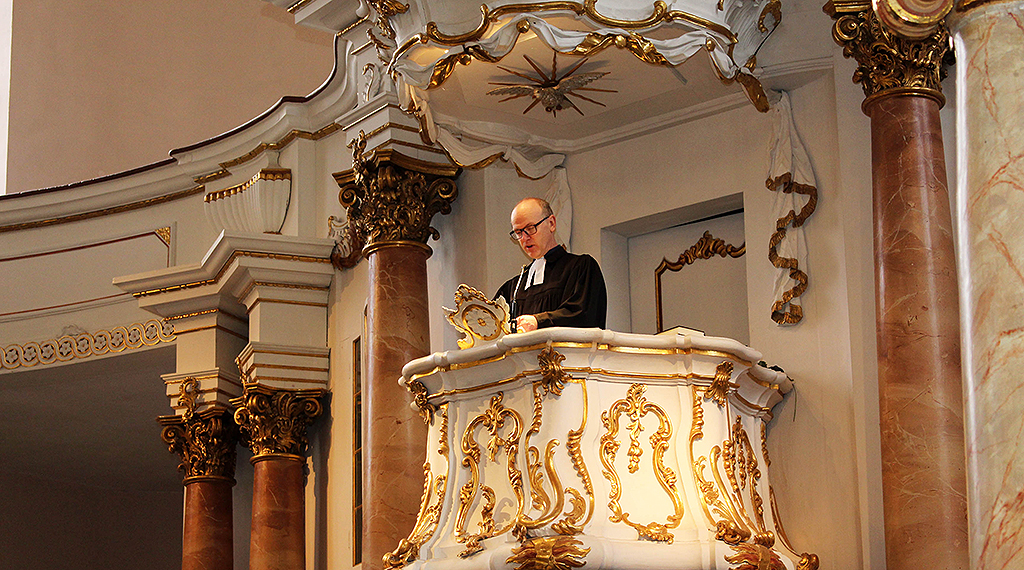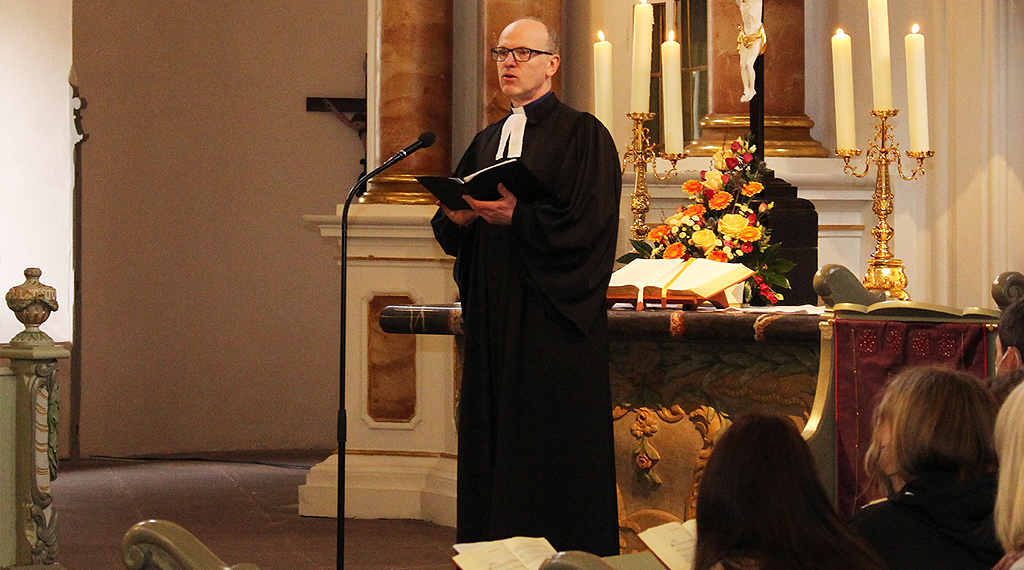 Dekan Seeberg hob in seiner Ansprache hervor, dass sich die Gersfelder in hohem Maße mit ihrer Kirche identifizieren. Die evangelisch-lutherische Pfarrkirche in Gersfeld gilt als eine der bedeutendsten evangelischen Kirchengebäude in Hessen und war vor zwei Jahren aufwändig saniert worden. „Diese Kirche öffnet einem das Herz und macht Lust, hier Gottesdienste zu feiern,“ so Seeberg. Neben der Gemeinde, die eine Kindertagesstätte und einen Friedhof in kirchlicher Trägerschaft unterhalte, gelte es für den neuen Pfarrer auch die Zusammenarbeit mit den Nachbargemeinden im Kooperationsraum Rhön und mit der katholischen Gemeinde in den Blick zu nehmen. Es sei die Aufgabe eines Pfarrers, ebenso wie die der ganzen Kirchengemeinde, zu zeigen, wie ein Leben im Licht des Evangeliums aussehen könne, sagte Seeberg. Dies sei gerade im Hinblick auf den Krieg in der Ukraine wichtig. „Als Christen setzen wir kriegerischer Gewalt ein klares Nein entgegen.“ In seiner Predigt betonte Pfarrer Stradal, er wolle den Menschen in seiner Gemeinde auf Augenhöhe begegnen. Die demütige und dienende Haltung, die Jesus bei der Fußwaschung eingenommen habe, sei auch heute erlebbar: „Gottesdienst heißt auch: Gott dient uns,“ sagte Stradal. Er wolle an die Traditionen des Protestantismus anknüpfen und die Liebe zur christlichen Tradition wachhalten, so der evangelische Pfarrer.