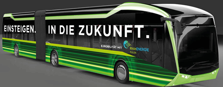 Etwa so wird der E-Gelenkbus aussehen, der ab dem Frühjahr 2018 die Linie 6 bedienen soll. Das in Sonderanfertigung gebaute Fahrzeug hat insgesamt 140 Plätze und eine Reichweite von bis zu 250 Kilometern. Foto: Abb. RhönEnergie Fulda