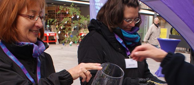 Am Tag der seelischen Gesundheit war das Diakoniezentrum Fulda wie bereits im Vorjahr mit mehreren Ständen am Borgiasplatz im Herzen von Fulda präsent. Mitarbeiterinnen und Mitarbeiter mit langjähriger Erfahrung im Bereich psychischer Erkrankungen standen als Ansprechpartner zur Verfügung und waren den gesamten Vormittag über stark gefragt. „Es kamen viele Menschen, die selbst erkrankt sind und andere, die einen Angehörigen mit seelischen Problemen haben“, berichtet Hildburg Hopf. „Ebenso konnten wir mit kreativen Aktionen auch viele Passanten neugierig machen und zu einem Gespräch motivieren.“ An einem der Stände erhielten die Besucher eine Murmel und mussten sich dann entscheiden, ob sie diese in ein Glas mit der Aufschrift „halb voll“ oder „halb leer“ werfen wollten. Alles eine Frage der Lebenseinstellung... Fest steht: Menschen mit einer seelischen Erkrankung sind keine „Psychos“, denen man aus dem Weg gehen sollte. Jeder kann seelisch erkranken, mit dem sozialen Status hat das nichts zu tun. Ob und wie schnell er oder sie dann wieder gesundet, hängt nicht nur von professioneller Hilfe ab, sondern auch vom sozialen Umfeld. Gehen die Angehörigen und Bekannten verständnisvoll mit der erkrankten Person um oder reagieren sie mit Ablehnung?