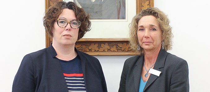 Erste Kreisbeigeordnete Susanne Simmler (links) spricht mit Iris Hurrlein, Leiterin des Amtes für Soziale Förderung und Teilhabe, über die anstehenden Aufgaben. Ziel ist es, den Opfern und Angehörigen des Terroranschlags in Hanau schnell und unbürokratisch zu helfen.