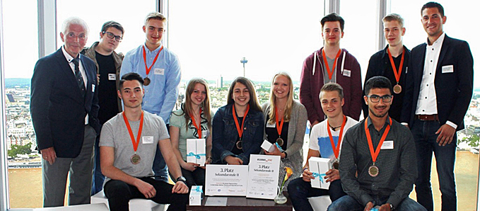 Stolz auf den dritten Platz: Die Schüler der Klasse WG 11 mit Klassenmentor Johannes Helmke (rechts) und Direktor Peter Vater (links)