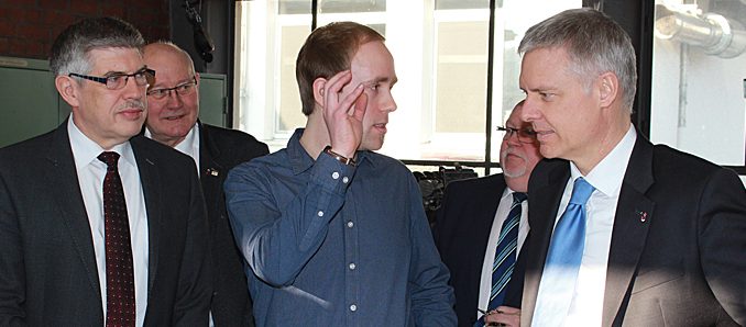 Lauterbach. Richtig viel Geld in die Hand genommen hat der Vogelsbergkreis, um seine beiden Berufsschulen in Lauterbach und Alsfeld auszustatten. Gut 1,5 Millionen Euro wurden in den beiden letzten Jahren in investiert, erklärte Landrat Manfred Görig beim Besuch des hessischen Kultusstaatssekretärs Dr. Manuel Lösel in der Vogelsbergschule nicht ohne Stolz und schob nach: „Das war auch notwendig, denn man kann nur vorne mit dabei sein, wenn die Technik stimmt.“ Im Beisein von Schulleiter Holger Arnold unterstrich der Landrat noch einmal die Bedeutung der beruflichen Schulen. „Sie sind sehr wichtig, sie tragen enorm zur Stärkung des ländlichen Raums bei.“ Deshalb ist der Vogelsbergkreis als Schulträger froh um jede Berufsschulklasse, die erhalten werden kann. Müssen Klassen zusammengelegt werden, so müssen sie nicht nur in Fulda oder Gießen angesiedelt werden, gab Manfred Görig zu bedenken. „Es geht auch umgekehrt! Der Weg kann auch von Fulda oder Gießen in den Vogelsbergkreis führen.“