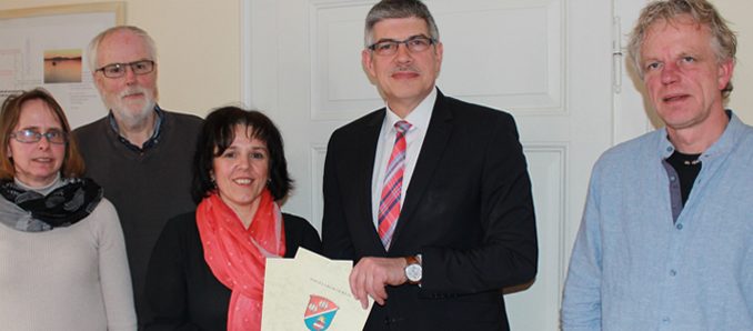 Landrat Manfred Görig (Zweiter von rechts) informierte sich über die Arbeit des Diakonischen Werks, insbesondere über die Aufgaben des Betreuungsvereins. Er überbrachte einen Förderbescheid über rund 44.000 Euro sowie 3.000 Euro für die Flüchtlingsarbeit. Auf dem Foto von links: Claudia Fürst, Pfarrer Manfred Hofmann, Leiterin Martina Heide-Ermel und Andreas Schulze-Schuch. Foto: Erich Ruhl-Bady
