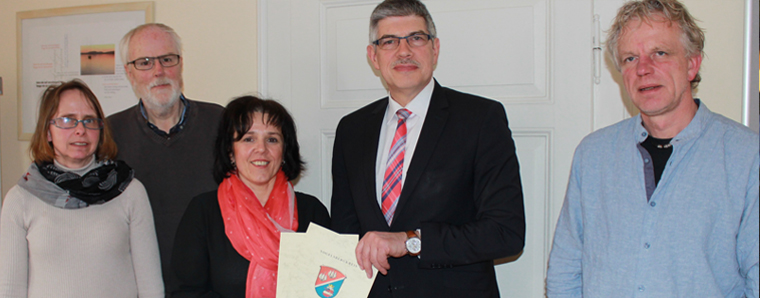 Lauterbach. „Das Wohl der hilfsbedürftigen Menschen steht im Vordergrund“, sagte Landrat Manfred Görig (SPD), als er im Gespräch mit Martina Heide-Ermel vom Diakonischen Werk (DW) in Lauterbach die unverzichtbare Arbeit des Betreuungsvereins herausstellte. Die Fachleute des Vereins koordinieren die ehrenamtliche Arbeit von rund 70 Bürgerinnen und Bürgern, die sich ehrenamtlich als gesetzliche Betreuerinnen und Betreuer engagieren. Unterstützt werden Menschen, die ohne die Betreuung ihren Alltag nicht mehr regeln könnten. Der Landrat überbrachte einen Förderbescheid über rund 44.000 Euro. Hinzu kommen 3.000 Euro für die Flüchtlingsarbeit des Diakonischen Werks. DW-Leiterin Heide-Ermel ist auch die Vorsitzende des Betreuungsvereins. Sie und ihr Stellvertreter Pfarrer Manfred Hofmann dankten dem Landrat für die zuverlässige und gute Unterstützung der wertvollen Arbeit.
