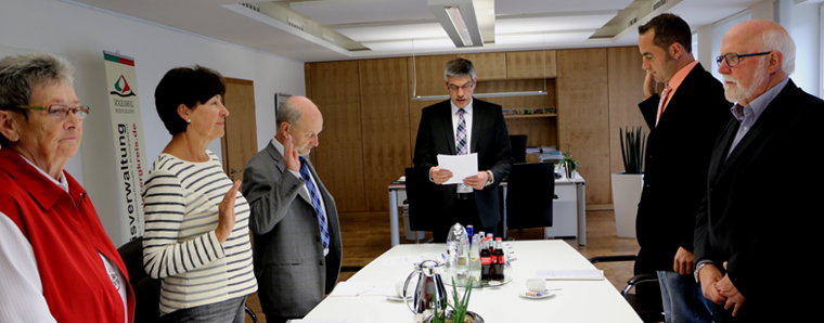 Landrat Görig (hinten) bei der Vereidigung der neuen Patientenfürsprecher. In jedem Krankenhaus gibt es diese Ansprechpartner für Patienten (v. l.): Ilse Well (Kreiskrankenhaus Alsfeld), Ute Kohlbecher (Stellvertreterin am Kreiskrankenhaus Schotten), Willi Zinnel (Kreiskrankenhaus Schotten), Stefan Schmelz (Stellvertreter an der Klinik Oberwald Grebenhain) und Heinrich Kauck (Klinik Oberwald Grebenhain). Es fehlt Helmut Hohmann (Stellvertreter am Kreiskrankenhaus Alsfeld). Foto: Gaby Richter
