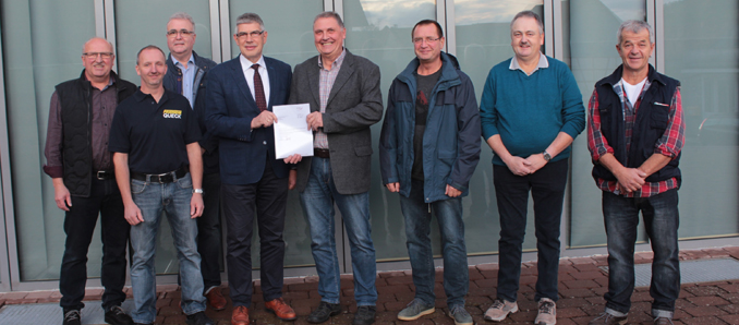 Landrat Manfred Görig übereicht Ortsvorsteher Hans Kraft den Bewilligungsbescheid: Dank der 4000-Euro-Spende können die Quecker nun eine Markise für die Sonnenterrasse an der Kulturscheune anschaffen. Foto: Sabine Galle-Schäfer