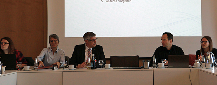 Dr. Julia Thurn und Dr. Stefan Eckl vom Institut für Kooperative Planung und Sportentwicklung stellten Landrat Manfred Görig sowie Renate Stiebing und Elisa Amerschläger aus der Abteilung Sportförderung (von rechts) und natürlich den Vertretern des Sportkreises die Ergebnisse ihrer Befragungen vor. Foto: Gaby Richter