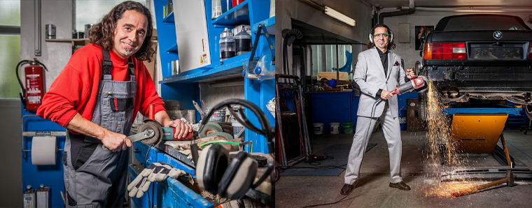 Den Betrieb in Dreieich-Sprendlingen gibt es schon seit 80 Jahren. Sallwey hat ihn in dritter Generation übernommen, wurde 1991 Meister und leitet mit seiner Lebensgefährtin die Werkstatt. Der ungewöhnlichste Job war das Lackieren eines Sarges erinnert sich Sallwey. „Dies musste über Nacht geschehen, in Perlmutt weiß wollten die Angehörigen die letzte Ruhestätte für den Verstorbenen“. Aber auch die diversen Motive, die er auf Kühlerhauben oder Helme lackiert hat können sich sehen lassen. Darunter Schlangen, Jack Daniels-Flaschen oder dezent angezogene Frauen. Der Karosseriebauer und Lackierer ist das Oktobermotiv der Kampagne Kleider machen Leute. Stephan Görner und Sven Müller sind die Initiatoren und möchten mit den Fotos von Nikita Kulikov Berufsgruppen und die Menschen dahinter würdigen. „Das Empfinden ist ein ganz anderes, wenn ein Mann im Nadelstreifenanzug oder im Blaumann einem gegenübersteht. Dabei handelt es sich um ein und dieselbe Person. Deshalb sollten auch der Respekt und die Würdigung seiner Leistung am Arbeitsplatz die gleiche sein – egal ob im feinen Zwirn oder im Monteuranzug, so Görner.