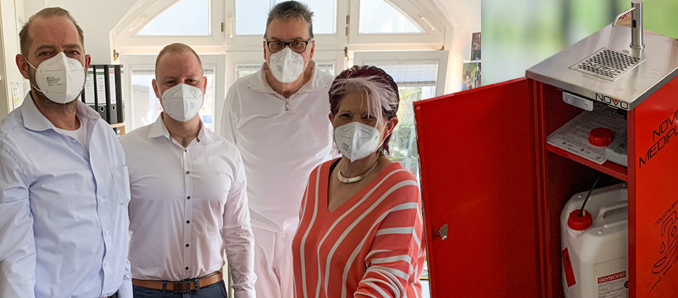 „Via Videokonferenz haben wir gemeinsam mit den Ingenieuren von Novo das Gerät entwickelt“, berichtet Udo Gärtner, der viele Jahre in Kanada gelebt und gearbeitet hat. In Nordamerika haben bereits viele Handelsketten die Automaten erworben. „Ikea Kanada und John Deere beispielsweise sind sofort begeistert gewesen und haben umgehend eine ganze Menge unserer Geräte bestellt“, sagt Gärtner. Eigens für die Produktion wurde die Firma Novo Mediplus gegründet. Hier in Deutschland liefert die Steinauer Firma Burnus Hycam das entsprechende Desinfektionsmittel für das neue Gerät. Generalimporteur für Europa ist die Firma Melzig in Sannerz. „Der große Vorteil ist, dass wir in dem Gerät große Mengen Desinfektionsmittel unterbringen können. Es müssen nicht ständig kleine Flaschen ausgewechselt werden. Besonders auch nicht an den Orten, in denen es viele Leute zu versorgen gilt“, sagt Robin Krack. Zwei unterschiedlich große Varianten wurden geschaffen: Eine herkömmliche und eine kleinere, die in Schulen und Kindergärten installiert werden kann.