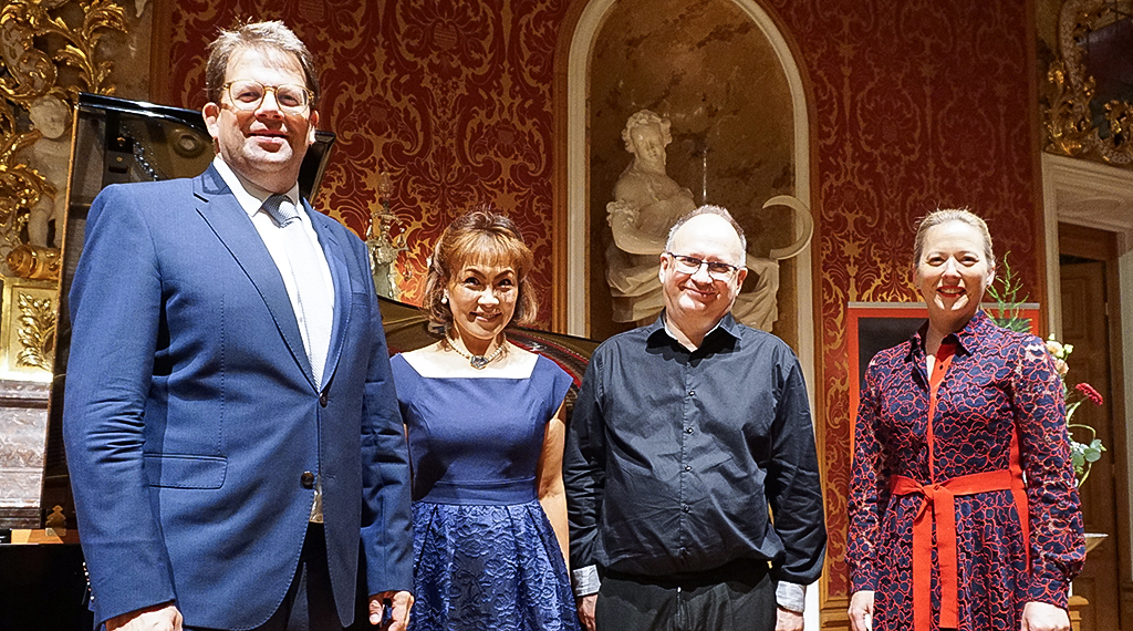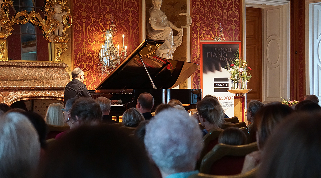 „Mein Körper ist noch in Sydney, mein Geist aber vollkommen heute Abend bei Ihnen und der Eröffnung“, sagte die PIANALE-Gründerin am Dienstagabend im gehobenen Ambiente des Fürstensaals. Da es für eine prätentiöse Darbietung am Flügel unerlässlich ist, dass Körper und Geist „beieinander“ sind, wie die international anerkannte Klaviervirtuosin herausstellte, verzichtete Weyand schweren Herzens auf ihr Mitwirken bei dem Eröffnungskonzert. Als Ausgleich boten ihre Dozentenkollegen, Graham Scott und Noriko Ogawa, ihre Spielkünste dem anspruchsvollen Fuldaer Publikum etwas länger dar. Für Graham Scott, der das gestrige Publikum mit 3 Mazurkas op. 59 und der Ballade Nr. 4 op. 52 f-moll sowie Liszt Präludium und Variationen nach J. S. Bach „Weinen, Klagen, Sorgen, Zagen“ verwöhnte, war sein Engagement bei der 16. PIANALE eine Prämiere; seine Kollegin, Noriko Ogawa, die dem Publikum Images Buch 1 1. Reflects dans l‘eau, 2. Hommage a Rameau und 3. Mouvement sowie Buch 2 1. Clouches a travers les feuilles, 2. Et la lune descend sur le temple qui fut, 3. Poissons d’or erstklassig darbot, war es so wie „heimkommen“. So wirkte Ogawa bereits in 2019 schon einmal bei der PIANALE mit. An Fulda und an das PIANALE Piano Festival hat sie wunderbare Erinnerung, wie sie gestern im Fürstensaal kundgab.
