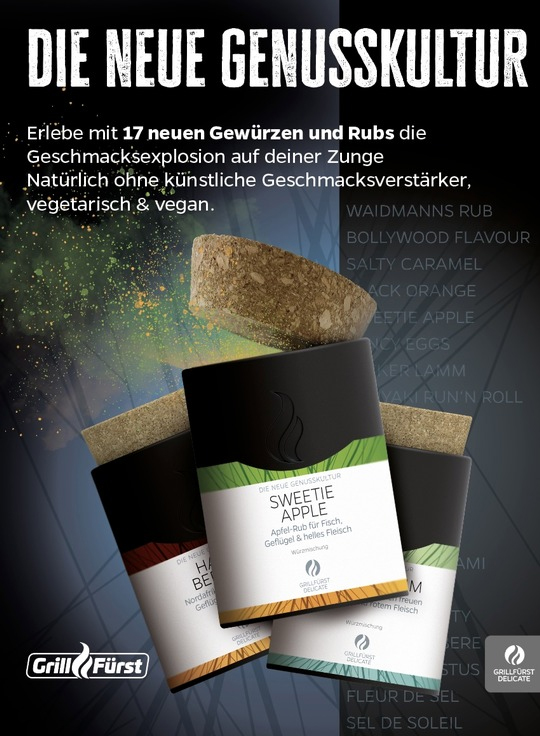 Gerade wenn man dachte, man kennt schon alles, überrascht Deutschlands Fachhändler und Grillexperte Nr. 1 mit neuen Produkten, die die Freude am Grillen einmal mehr anfachen. Mediterrane Noten mit Salzflocken, Aromen rund um Waldpilze und Wacholder, exotische Interpretationen, die nach Asien entführen oder etwas für den süßen Zahn – die 17 Grillfürst Gewürze, Salze-Kreationen und Rubs entführen in neue Geschmackswelten. Wer bisher dachte, dass Vielfalt am Grill nur durch die Auswahl des Grillguts zustandekommt, irrt. Denn in Sachen Geschmacks-Explosion und Aroma-Abenteuer können Grill-Begeisterte ab sofort auf etwas brandneues zurückgreifen: 17 Grillfürst Gewürzmischungen und Rubs inspirieren ab sofort zu neuen Kreationen. Dabei überzeugen die Produkte mit einer unglaublichen Vielfalt und erlauben feurig-scharfe, herzhafte, salzige und sogar süße Speisen. Dass die Aroma-geladenen Gewürzkreationen den Spaß am Experimentieren wecken, wird schon bei den Namen deutlich: Rub’nRoll, Mystery Umami oder In Vino Gustus sind nur einige der Namen, die schon beim Lesen Bilder im Kopf erzeugen und das Wasser im Munde zusammenlaufen lassen. Die Grillfürst Gewürze und Rubs mögen teils sehr exotisch klingen, werden in Deutschland abgefüllt und nach höchsten Qualitätsstandards und mit hochwertigen Zutaten zusammengestellt. Es gibt sie in Dosen von 75 bis 130 g und sie sind vorerst im Grillfürst Onlineshop wie auch in den Grillfürst Stores erhältlich. Alle eignen sich zum verfeinern verschiedener Fleischsorten, Fisch, Gemüse- oder Grillkäse-Gerichte, aber auch Spießen und sogar Gebäck vom Grill. Dabei ist die Range vielfältig, lecker und soll vor allem eines bezwecken: den Spaß und die Kreativität beim Grillen maximal erhöhen. Vom Grillmeister bis zum Gast ist der Grill-Genuss garantiert.
