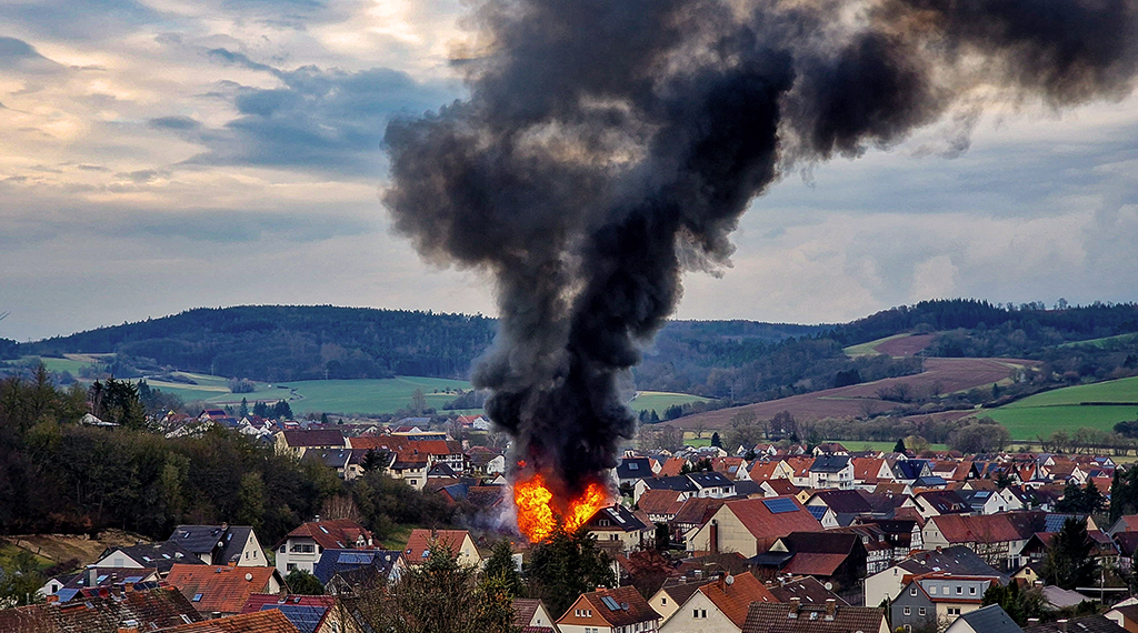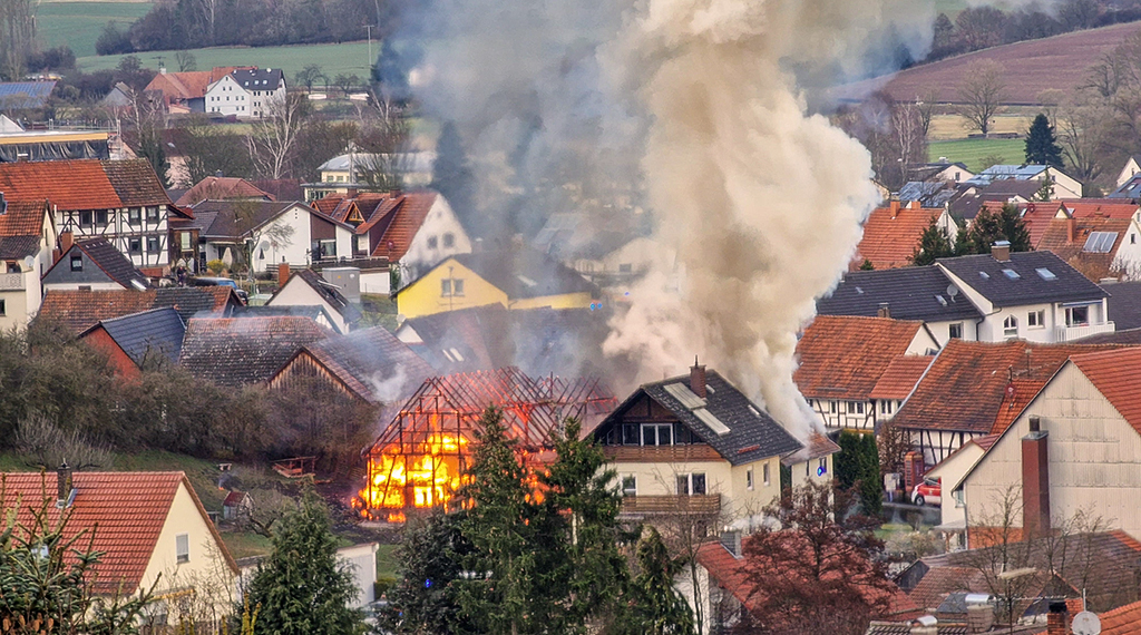 Meterhohe Flammen, eine dichte Rauchsäule und über 100 Einsatzkräfte: In der Gemeinde Angersbach ist es am Montagabend zu einem verheerenden Großbrand gekommen. Feuerwehr und Rettungsdienst wurden alarmiert, da mitten im Ort eine Scheune in Vollbrand stand. Die Flammen griffen rasch auf zwei benachbarte Wohnhäuser über.