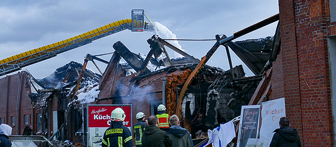 Großalarm im Bad Hersfelder Gewerbegebiet. Am Sonntag kam es zu einem Brand eines Möbelmarktes in der Gutenbergstraße. Gegen 2.20 Uhr wurde die Rettungsleitstelle alarmiert. Bei Eintreffen der Einsatzkräfte war an dem Gebäudekomplex bereits eine starke Rauchentwicklung festzustellen. Zudem schlugen Flammen aus dem Dach des Gebäudes. Der Brand bereitete sich rasch über den Lager- und Ausstellungsraum über den gesamten Möbelmarkt aus, so dass dieser in kurzer Zeit in Vollbrand stand. Der Brand konnte von den rund 200 Einsatzkräften der Feuerwehren aus Bad Hersfeld und aus dem Landkreis Bad Hersfeld unter Kontrolle gebracht werden. Ein Übergreifen des Brandes auf benachbarte Firmen des Gebäudekomplexes konnte verhindert werden. Der entstandene Schaden wird vorläufig auf etwa 1 Million Euro geschätzt. Nach derzeit vorliegenden Erkenntnissen wurden durch den Brand keine Personen verletzt. Die Löscharbeiten werden vermutlich noch bis zum Nachmittag andauern. Wie es zu dem Feuer kommen konnte, ist derzeit noch unklar und Bestandteil der weiteren Ermittlungen der Kriminalpolizei in Bad Hersfeld. Hinweise bitte an die Polizeistation Bad Hersfeld unter Telefon 06621/932-0, jede andere Polizeidienststelle. +++