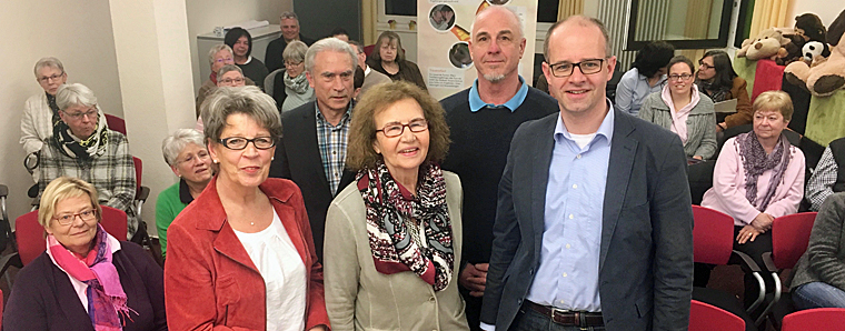 Sensibler Vortrag „Kindertrauer ist maskiert“ von Dr. Ingrid Chiari (Mitte) beim Hospiz-Förderverein Fulda mit dem Vorsitzenden Michael Brand MdB (rechts), den Stellvertretern Silvia Hillenbrand (links) und Martin Hoogen (2.Reihe rechts) sowie Schriftführer Manfred Schüler (2.Reihe links) im Fuldaer Hospiz-Zentrum der Malteser