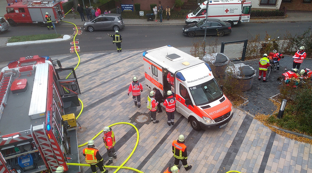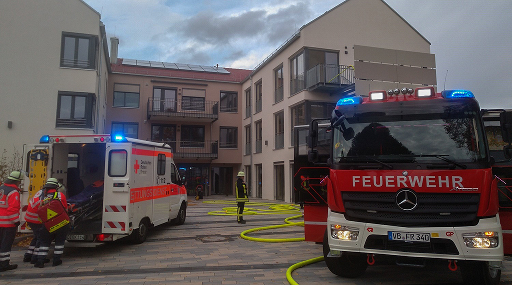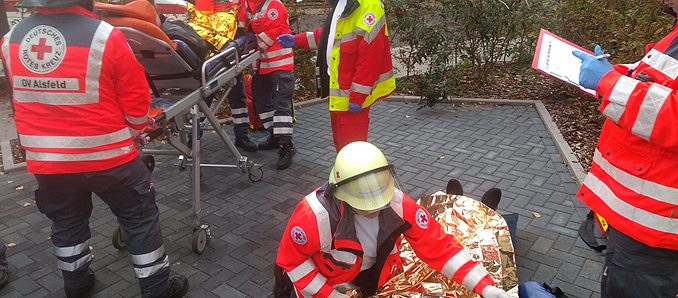 Aus dem halben Kreisgebiet rückten am Samstagmittag zahlreiche Rettungskräfte zu einer Großübung nach Romrod aus. Das Szenario sah einen Brand in dem neuen Seniorenwohnheim in der Ortsmitte vor, bei dem es mehrere Verletzte gab. „Das Feuer brach im zweiten Obergeschoss aus und schloss mehrere Bewohner in Rauch und Flammen ein“, schilderte einer der Übungsinitiatoren Ulf Immo Bovensmann vom Alsfelder Kreisverband des Deutschen Roten Kreuzes zum Ausmaß.