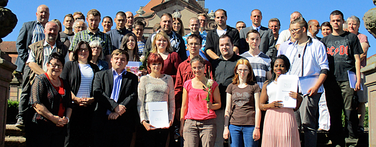 Im Anschluss an die Glückwünsche erhielten die Reha-Auszubildenden der unterschiedlichen Fachbereiche ihre Zeugnisse: Maria Nabachwa (Fachkraft für Textilreinigung); Sebastian Dittmann, Jean-Michel Mikusch und Marc Neidert (Holzbearbeiter, alle Ausbildung 3.5), Mandy Hartz und Felix Rex (Fachpraktiker für Lagerwirtschaft); Kerstin Braun, Maria Arnd und Kathrin Dimmerling (Helferin in der Hauswirtschaft – Arndt und Dimmerling Ausbildung 3.5); Aaron Alles, Darline Müller, Dominik Radziej und Alexander Suppes (Beikoch/Beiköchin); Tobias Eckart, Marius Heres und Steven Käbisch (Gartenbauwerker); Adrian Bug, Marcel Kempf, Alexander Mosmann und Jasmin Schrödel (Fachkraft für Verkaufsvorbereitung); Dominik Jahn (Metallbearbeiter, BBZ).