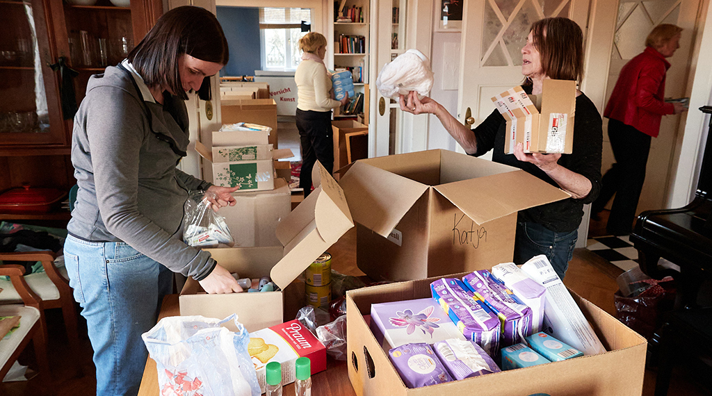 Und dann wurde eingepackt! „Es heißt so schön, viele Hände machen ein schnelles Ende“, so Marie-Louise Puls, die Sprecherin des Stadtverbands, „aber schnell war erst mal gar nichts. Denn es kamen noch etliche Sachspenden dazu, vom faltbaren Outdoor-Ofen über Batterien bis zu OP-Handschuhen. Die Anteilnahme und Solidarität der Fuldaer Bürger hat uns alle überwältigt.“ Alle Pakete wurden umsichtig gepackt und beschriftet, damit die Waren vor Ort zielgerichtet verteilt werden können.