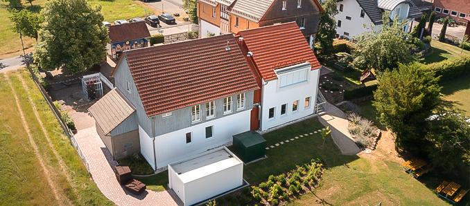 Der Altbau wurde ebenfalls komplett saniert. Dies war eine besondere Aufgabe, denn das mehr als hundert Jahre alte Gebäude, das in den Jahren 1908/1909 errichtet wurde, steht unter Denkmalschutz. Die Fassade wurde im oberen Bereich zum Schulhof hin mit einer neuen Verschindelung ausgestattet. Das Fachwerk darunter wurde teilweise erneuert. „Dabei wurde darauf geachtet, dass die ursprüngliche Optik erhalten bleibt“, sagt Jürgen Obermeier, Leiter des Fachdienstes Gebäudemanagement beim Landkreis Fulda. So wurden beispielsweise die alten Fenster im Bereich des Treppenhauses wiederverwendet. Auch im Inneren des hübschen, historischen Gebäudes hat sich viel verändert: Nach einer neuen Raumaufteilung bietet es nun Platz für eine Mensa mit Essensausgabe und Aufenthaltsbereich. Hierzu wurde eine Fachwerkwand als Raumtrenner eingebaut. Im Obergeschoss befindet sich jetzt außerdem die Schulverwaltung mit Lehrerzimmer und Küche. Die beiden Klassenräume im Erdgeschoss waren bereits bei einer früheren Maßnahme saniert worden.
