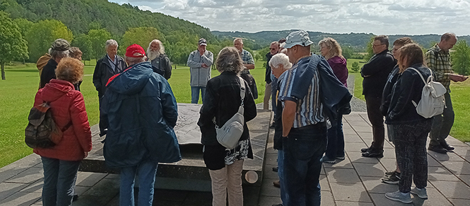 Beklemmende Gefühle, Gefühle von Wut und Trauer löst das Lager-Krematorium aus. Seit Herbst 1944 ist der Backsteinbau mit seinen Öfen in Betrieb. Etwa 5.000 Opfer sind dort verbrannt worden. Unfassbar: Ihre Asche ließ die SS am Hang dahinter einfach abkippen. Wiederum ist es die friedliche Natur, der herrliche Sonnenschein, der sanfte Wind, der durch die Bäume streicht, die die mörderische Lager-Wirklichkeit fast vergessen machen. Das überlebensgroße Mahnmal für die Opfer auf dem Gedenkplatz davor, symbolisch durch eine Gruppe Gefangener dargestellt, macht jedoch auf bedrückende Weise bewusst, weshalb die GSP-Gruppe sich an diesem Ort versammelt hat. „Um zu erinnern, zu gedenken und zu mahnen“, wie Sektionsleiter Schwab beim gemeinsamen Niederlegen einer Schale betont. „Wir erfüllen so den Satzungsauftrag unserer Gesellschaft, der GSP, und leisten ein Stück Friedensarbeit.“ In seinem Wort an die Mitglieder und Gäste der Fuldaer GSP-Sektion greift er die Erinnerungen des französischen Gefangenen Aimé Bonifas auf, der das KZ Mittelbau-Dora überlebt hat, und die Situation geflüchteter Häftlinge bereits 1946 in einem auf Französisch publizierten Erinnerungsbericht schildert. Bonifas spricht darin von Deutschland als einem „verlorenen Land.“ „Wir jedoch wollen, dass unser Land nie wieder ein verlorenes Land ist, sondern ein offenes, in dem Menschen in Frieden und Freiheit leben können. Dafür setzen wir uns mit aller Kraft ein.“ Schwabs Vorgänger Michael Trost - im Sektionsvorstand heute „Beauftragter für Informationsfahrten“ – betont: „Wenn wir uns zum ehrenden Gedenken an die Tausenden Opfer von Unmenschlichkeit, Rassenwahn und erbarmungsloser Zwangsarbeit hier an diesem Ort verneigen, versprechen wir, wie in unserer Einladung zur Tagesfahrt formuliert, die richtigen Lehren aus der Geschichte zu ziehen und die Demokratie zu stärken.“ Vor dem Hintergrund steigenden Rechtsextremismus in Deutschland wie in Europa bedeute das „für unsere Sektion auch, gemäß unserer Satzung, für eine wehrhafte Demokratie einzutreten.“ +++ ms