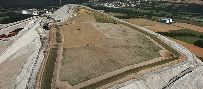 Vollständige Abdeckung des bestehenden Haldentops: Das Foto zeigt den Bauzustand im Spätsommer 2024. Im Hintergrund der Standort Hattorf, die Gemeinde Philippsthal sowie das Analytik- und Forschungszentrum von K+S. Foto: K+S