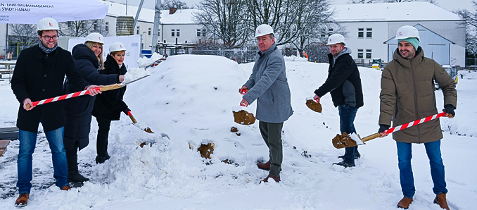 Das Baufeld an der Brüder-Grimm-Schule ist vorbereitet, in Kürze werden dort die Bauarbeiten für das neue Schulgebäude beginnen. Dies feierten Oberbürgermeister Claus Kaminsky, Bürgermeister Dr. Maximilian Bieri sowie Vertreter der Verwaltung, der Schule und der Stadtverordnetenversammlung während des symbolischen Spatenstichs. Die Stadt Hanau investiert rund sieben Millionen Euro, das Gebäude soll im Sommer 2025 bezugsfertig sein.