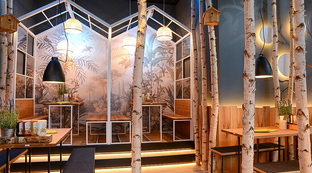 Nicht nur kulinarisch, auch optisch hat der Burgergrill in Fulda auf 190 Quadratmeter einiges zu bieten. Vom verträumt gestalteten Eingangsbereich gelangen die Gäste ab sofort in einen Gastraum, der mit 7,50 Meter Deckenhöhe beeindruckt und zum gemütlichen Essen an rustikalen Holztischen einlädt. Wer nur einen Drink genießen möchte, findet im Lounge-Bereich an der Bar den richtigen Ort. Die perfekte Kulisse für Erinnerungs-Selfies mit Freunden bildet der Insta-Bereich, der Elemente der Orangerie und des Botanischen Gartens Fuldas aufgreift.