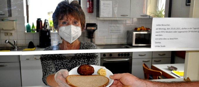 Über die Winterzeit hatten die beiden Caritasverbände in Fulda in Kooperation mit der Innenstadtpfarrei durch den „HOT-TRUCK“ die tägliche Versorgung von Obdachlosen und Nichtsesshaften mit warmen Mahlzeiten sichergestellt. Leider hat die Corona-Pandemie, wenn auch die Inzidenz stetig sinkt, weiterhin eine vollständige Öffnung von Aufenthaltsräumen und Essensausgabestellen wie die Vinzenzküche des Mutterhauses oder der Bahnhofsmission bislang noch verhindert. Die Caritas wolle keine neue Versorgungsstruktur aufbauen, doch Bedürftige sollten übergangsweise eine „warme Mahlzeit auf die Hand“ bekommen, so Geschäftsführerin Susanne Saradj. Die Räumlichkeiten von Haus Jakobsbrunnen und das angrenzende Gartengelände würden unter Einhaltung der Hygiene- und Abstandsregeln diese Möglichkeit bieten, so Bereichsleiter Torsten Hammer. Deshalb gibt es montags bis freitags, außer mittwochs, zwischen 9 bis 12 Uhr verschiedene Angebote wie warmer Fleischkäse oder Frikadelle mit Brot für 80 Cent.