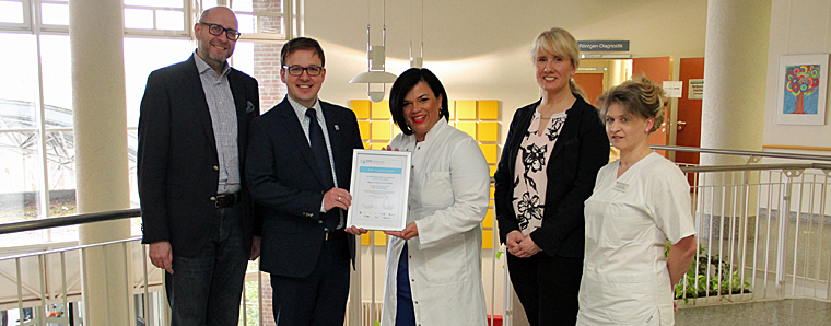 v. l. Prof. Dr. Dirk Breitmeier (Kreisgesundheitsamt), Erster Kreisbeigeordneter Frederik Schmitt, Dr. Sandra Beres (Helios-Klinik), Claudia Nüchter (Kreisgesundheitsamt) und Hygienebeauftragte Angelina Helbig (Helios-Klinik) bei der Siegel-Übergabe.