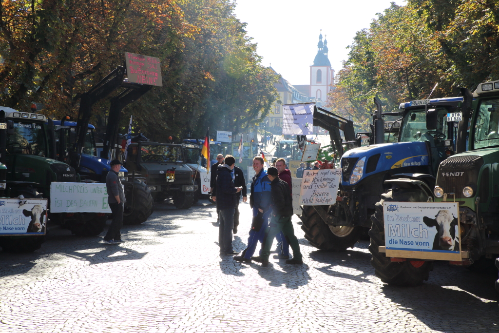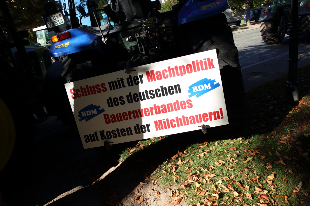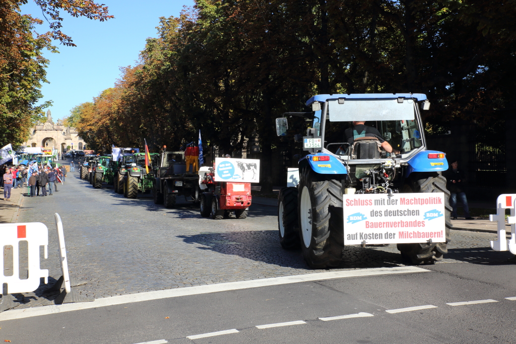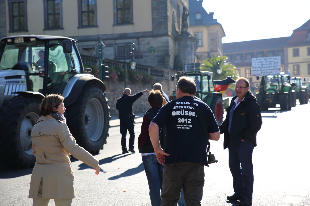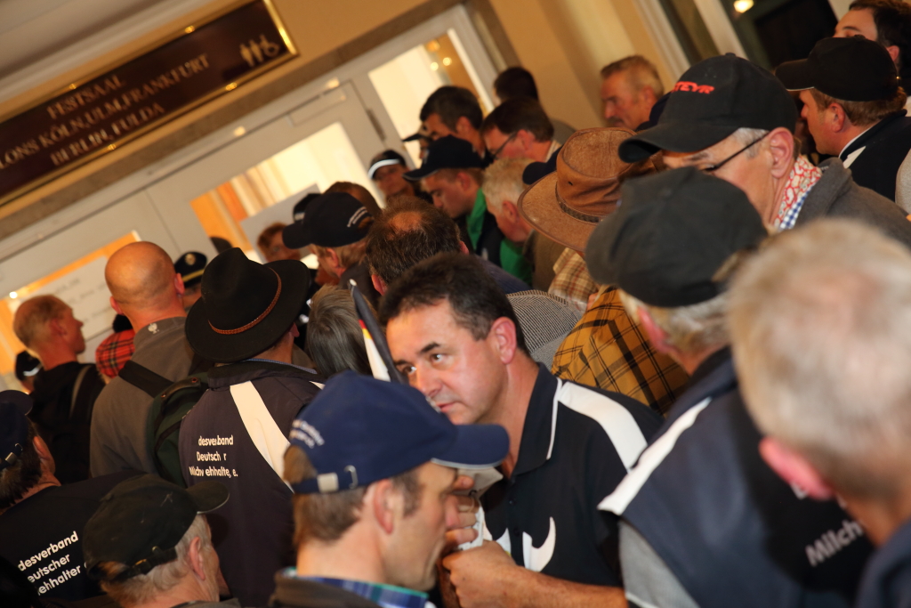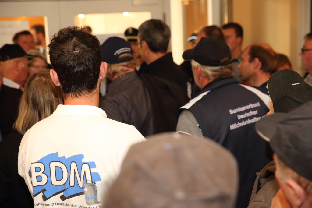 Fulda. 100 Schlepper und rund 300 Milchviehhalter des Bundesverbandes Deutscher Milchviehhalter aus dem ganzen Bundesgebiet, begleiteten am heutigen Freitag die Agrarministerkonferenz 2015 im osthessischen Fulda. Die Milchviehhalter machten in einer Kundgebung nachdrücklich deutlich, wie ernst es um ihre Höfe in der aktuellen Situation steht. Jeder Betrieb macht aktuell – mit jedem gemolkenen Liter Milch – Verlust. „Die Situation ist nicht länger durchzuhalten, es braucht daher greifbare Ergebnisse dieser Agrarministerkonferenz“ – wollten die Milchbauern den Ministern und insbesondere Bundesagrarminister Christian Schmidt (CSU) deutlich machen und enterten daher kurzerhand die Tagungsörtlichkeiten der Minister. Bundesagrarminister Schmidt traf sich nach der abschließenden Pressekonferenz mit einer Delegation des BDM für ein bilaterales Gespräch, um bestehende atmosphärische Störungen zu besprechen und den Weg für weitere Gespräche zu eröffnen. Auch die BDM-Bäuerinnen hatten noch einmal Gelegenheit, in einem Gespräch mit Gastgeberin Ministerin Priska Hinz (Bündnis 90/Die Grünen) ihre Situation zu schildern.