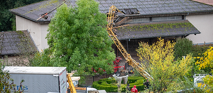Dramatische Szenen spielten sich auf dem Gelände der Behindertenwerkstätten der Gemeinschaft Altenschlirf ab: Ein Baukran stürzte um und beschädigte eine Scheune schwer. Mehrere Menschen entgingen nur knapp dem Unglück.