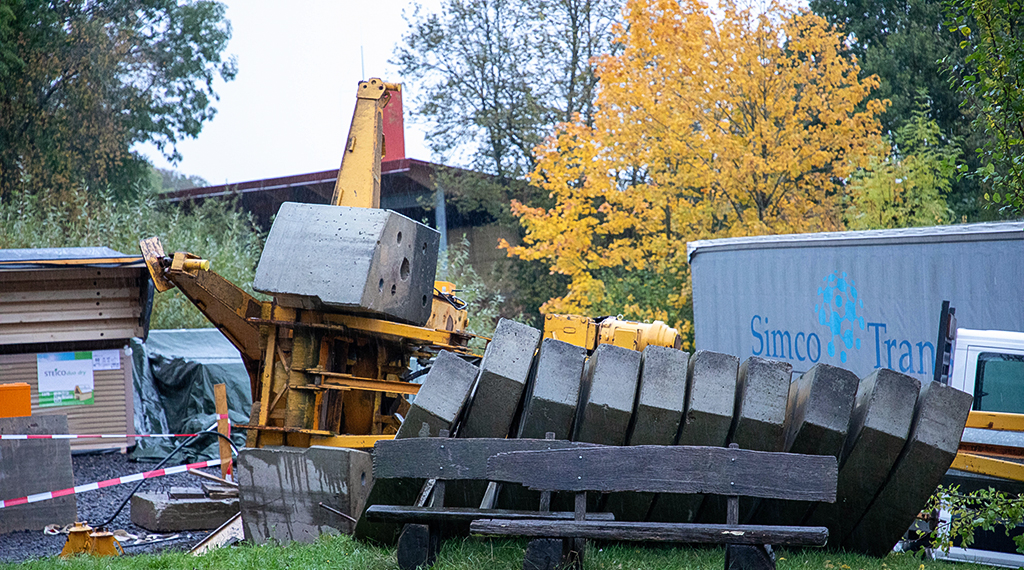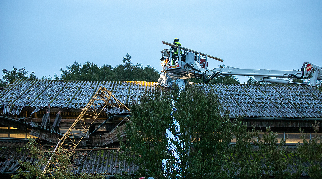 Tagelange, heftige Regenfälle hatten den Boden aufgeweicht. Als der Kran Fertigteile für einen Neubau von einem Tieflader hob, gaben die Stützen nach. Der Kran kippte um und der Ausleger schlug in das Dach einer Scheune ein, in der Stroh und Gerätschaften lagerten. Der Dachstuhl wurde zerstört.