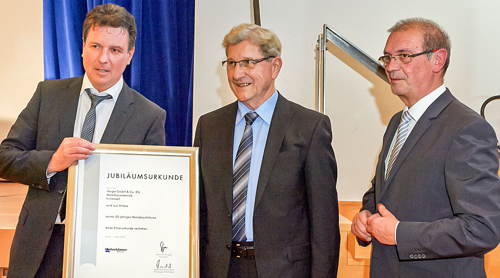 Ähnlich sah das Eichenzells Bürgermeister Dieter Kolb, der Walter Herget als „Pionier“ bezeichnete und zugleich betonte: „Sich in einer solchen Branche zu etablieren, war sicher nicht leicht – aber Sie haben es verstanden. Diese Leistung verdient höchste Anerkennung.“ So verwies auch Kolb auf den regionalen Profit aus dem Erfolg des Klimatechnik-Unternehmens. Zahlreiche Arbeitsplätze seien beispielsweise geschaffen und gemeindeeigene Gebäude zudem mit energiesparenden Systemen der Herget GmbH Co. KG ausgestattet worden. Neben Urkunden für die geehrten Mitarbeiter hatte der stellvertretende Geschäftsführer der Kreishandwerkerschaft Fulda Dietmar Weidenbörner auch für das Unternehmen etwas im Gepäck: Die Ehrenurkunde der Handwerkskammer Kassel, über die sich besonders Gründer Walter Herget freute, bevor er den Abend mit Familie, Gästen und Mitarbeitern bei einem raffinierten Menü des Hünfelder Caterers Elmar Zuspann ausklingen ließ.