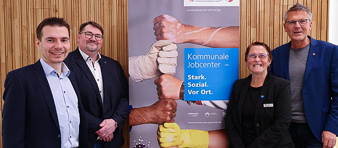 Marvin Kraft (Arbeitgeberservice Agentur für Arbeit, Bad Hersfeld), René Bieber (Leiter Kommunales Jobcenter Hersfeld-Rotenburg), Lonie Manns (Fachdienstleiterin Arbeitsmarkt und Integration) und Erster Kreisbeigeordneter Dirk Noll sind zufrieden mit der Resonanz auf die Jobmesse. Foto: privat