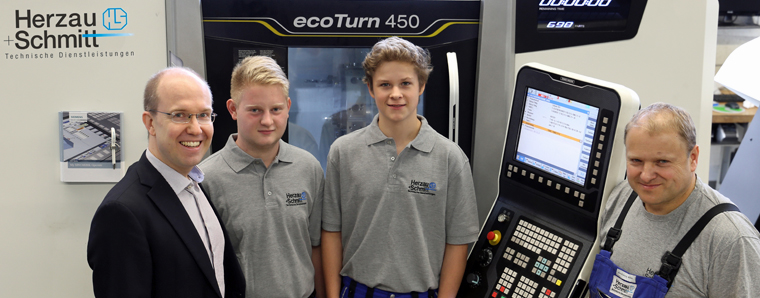 Investition in die Zukunft: Einsatz an der neuen CNC-Drehmaschine mit Geschäftsführer Markus Schmitt, den neuen Azubis Henri Günther und Marius Habig sowie Dreh- und Frästechnikleiter Andreas Weber (von links).