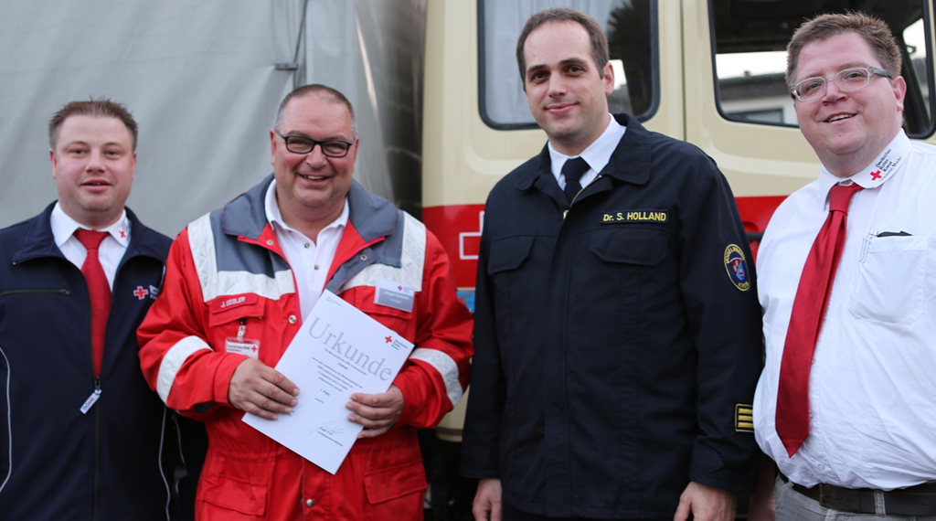 Jürgen Geißler wurde im Rahmen der Landesübung mit dem silbernen Leistungsabzeichen des Hessischen DRK-Landesverbandes und mit der bronzenen Einsatzspange der DRK-Landesverstärkung Hessen-Fritzlar ausgezeichnet. Geißler engagiert sich seit Jahren in der ehrenamtlichen Arbeit des Deutschen Roten Kreuzes, sei es bei Ausbildungen oder Einsätzen. Egal ob am Hessentag oder im Hochwassergebiet, Jürgen Geißler half im Namen des DRK. „Es sind viele engagierte Jahre“, fasste dazu Kreisbereitschaftsleiter Bovensmann zusammen. Ehrende Worte richtete der Kreisbereitschaftsleiter auch an Gruppenführer Klaus Jäger, der bereits zum zweiten Mal Landesmeister mit einer Mannschaft im Betreuungsdienst wurde. Für die Mannschaft der DRK-Helfer im Betreuungsdienst hielt der DRK-Kreisverband Alsfeld im Rahmen der Feierstunde ein Präsent bereit, das Utensilien für die Ausstattung der Feldküche beinhaltete. +++ fuldainfo | pw
