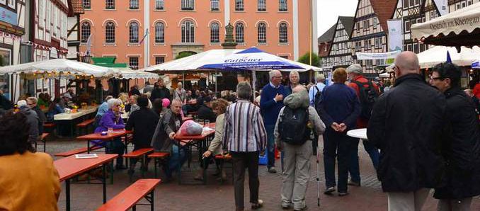 „Grenzen überwinden“, ist das Motto der Bundesratspräsidentschaft von Ministerpräsident Volker Bouffier. Zwei Elemente der Landesausstellung, in der sich die Landesregierung und Landesbehörden sowie Vereine und Verbände präsentieren, standen stellvertretend für diese Maxime: Im 25. Jahr der Deutschen Einheit blickt die Wander-Ausstellung „Von der Diktatur zur Demokratie“ zurück auf Geschichte und Geschichten rund um die deutsche Teilung und den politischen Prozess bis hin zur Wiedervereinigung. Beliebtestes Fotomotiv war die Kunst-Installation der „Einheitsmännchen“ von Professor Ottmar Hörl, die auf ihrer Tour durch Deutschland Halt in Hofgeismar machte.