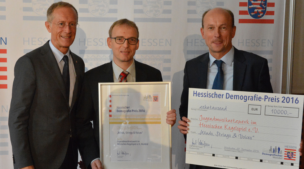 Wiesbaden. Der Sieger des 7. Hessischen Demografie-Preises kommt aus dem Landkreis Fulda und darf sich über 10.000 Euro Preisgeld freuen: Der Chef der Hessischen Staatskanzlei und Demografie-Beauftragte der Landesregierung, Staatsminister Axel Wintermeyer, zeichnete heute in der Regierungszentrale das Projekt „Winds, Strings & Voices“ des Jugendmusiknetzwerks im Hessischen Kegelspiel e.V. aus Hünfeld aus. „‚Winds, Strings & Voices‘ hat die Jury mit einem tollen Konzept überzeugt“, sagte Axel Wintermeyer. Den mit 7.000 und 3.000 Euro dotierten zweiten und dritten Platz belegten die „tegut…Lädchen“ des in Fulda ansässigen Einzelhandelsunternehmens und das Projekt „Expedition vor der Haustür“ des „theaters 3 hasen oben“ aus Ottrau-Immichenhain. Zu den sechs Finalisten, die in Wiesbaden geehrt wurden, gehören neben den drei Preisträgern auch die Projekte Gemeindeschwester 2.0 aus Schenklengsfeld, das AusbildungsNavi Hersfeld-Rotenburg und „Wir lieben MINT“ der Reichenberg-Schule aus Reichelsheim. In diesem Jahr hatten sich 91 Initiativen um den Demografie-Preis beworben, der seit dem Jahr 2010 verliehen wird.