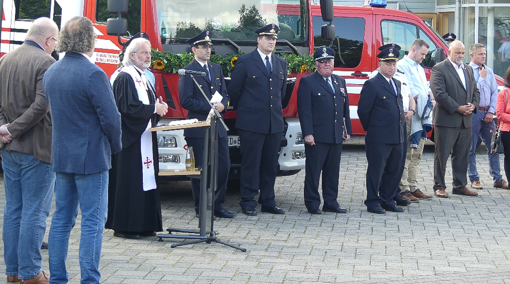 Für Bürgermeister Johannes Rothmund war es die erste Indienststellung eines Feuerwehrfahrzeugs in seiner Amtszeit. In seiner Rede betonte er, dass das Fahrzeug nicht für die Feuerwehr angeschafft wurde, sondern für die Bürgerschaft der Gemeinde Eichenzell, um zügig, wirkungsvoll und zeitgemäß Hilfe leisten zu können. Allerdings ist ein Fahrzeug ohne die, die es bedienen und damit umgehen können, nichts wert. Angesichts dessen, freute er sich besonders über viele junge Einsatzkräfte, die bereit seien, diese Verantwortung zu übernehmen. Die kirchliche Segnung nahmen Pfarrer Michael Rother und Pfarrer Edwin Rüder vor. Pfarrer Rother nannte die Feuerwehr auch im Sinne der Gemeinschaft eine unverzichtbare Institution, Pfarrer Röder bezeichnete die Einsatzkräfte als „Herz des neuen Wagens“ und betonte, wie wichtig es gerade bei der Feuerwehr sei, dass sich die Feuerwehrleute aufeinander verlassen können.