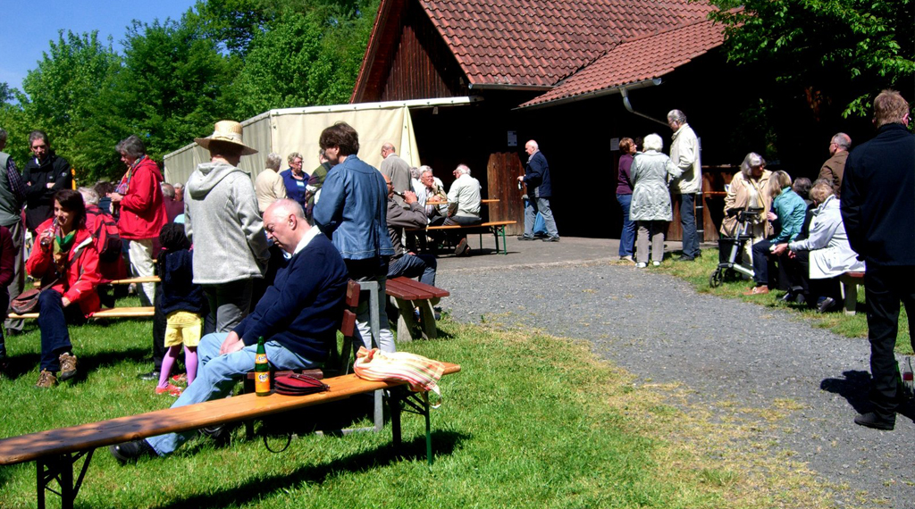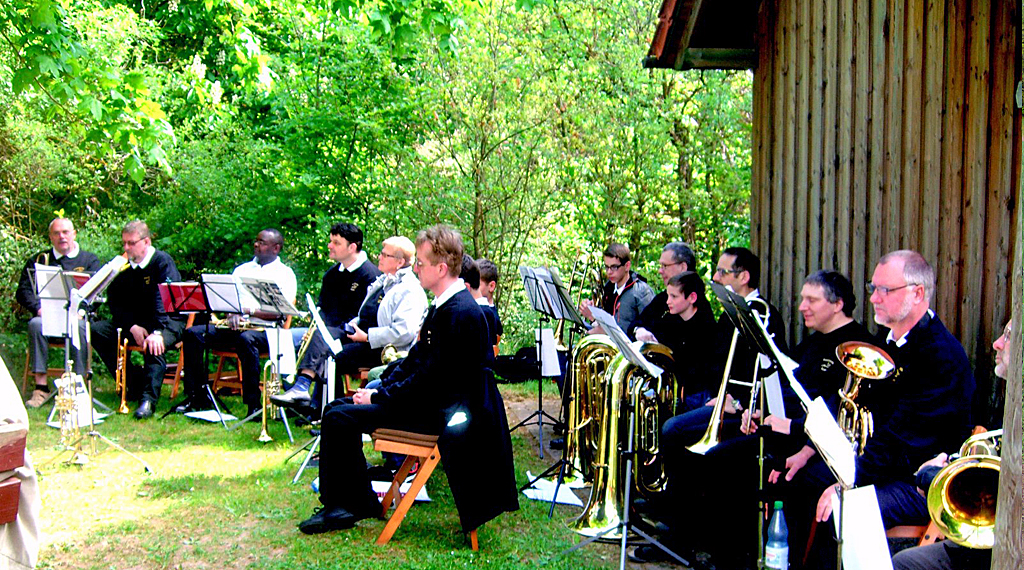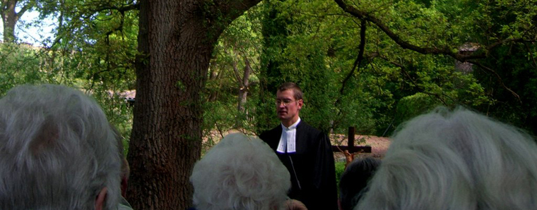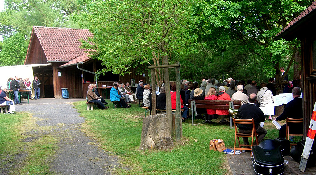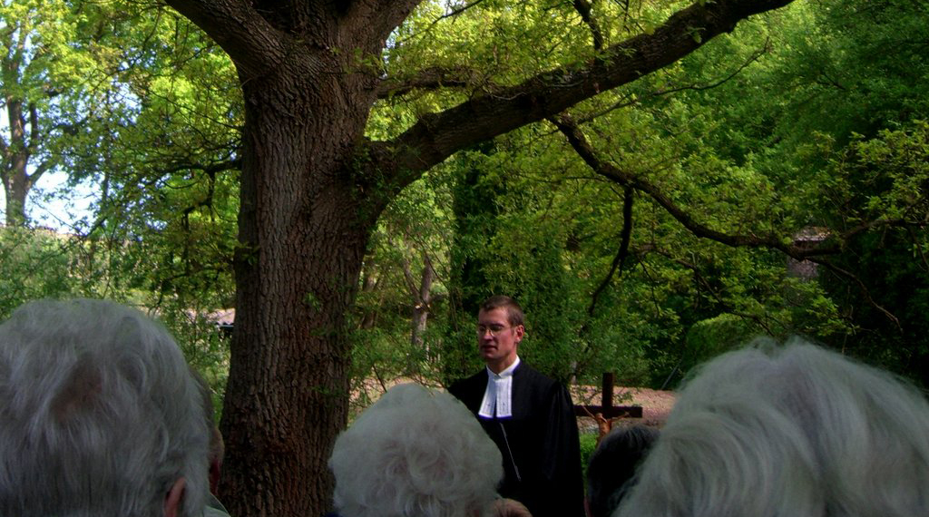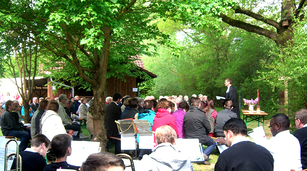 Pfarrer Johannes Wildner zeigte sich nicht nur erfreut über das gute Besucherecho, er hatteseine Predigt auch an Lukas 24 angelehnt und damit eine sehr beeindruckende Predigt den Anwesenden zu Gehör gebracht. Beeindruckend auch die musikaliche Begleitung des Gottesdienstes durch den Posaunenchor unter Leitung von Karlheinz Falk, der inzwischen erstaunlich viele junge Posaunisten mit den erfahrenen Musikern vereinigen konnte. Für sie dürfte es einer der ersten musikalischen Auftritte vor so vielen Menschen gewesen sein. Pfarrer Wildner ging zunächst darauf ein, welche Bedeutung früher die Bäume für die Gläubigen hatte und ließ die Anwesenden hochblicken auf die besonders stattliche Eiche, die dem Freizeitgelände mit weiteren Bäumen eine besondere Note verleiht.