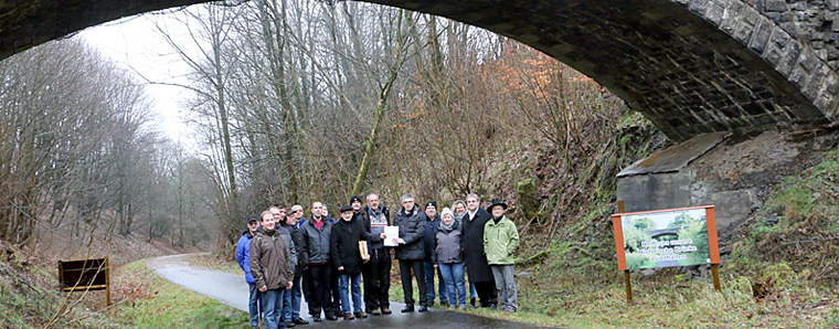 „Helft uns unsere Historische Brücke zu erhalten“ steht auf dem Schild – genau das tat Landrat Görig mit dem Überreichen einer OVAG-Spende an den Vereinsvorsitzenden Gerd Köhler. Grebenhains Bürgermeister Sebastian Stang, Mitglieder des Vereins „Historische Brücke Hartmannshain“ und des Ortsbeirats setzen sich dafür ein, dass die Brücke noch in diesem Jahr saniert und mit einem „Brückenfest“ wieder eröffnet werden kann. Foto: Gaby Richter