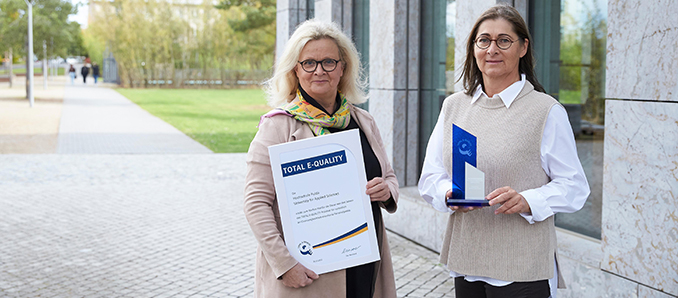 Professorin Dr. Kathrin Becker-Schwarze (l.), Vizepräsidentin für Lehre und Studium, und Birgit Hohmann, Frauen- und Gleichstellungsbeauftragte, mit dem Nachhaltigkeitspreis für Gleichstellungsarbeit und dem TOTAL E-QUALITY-Prädikat, das der Hochschule Fulda nun zum fünften Mal verliehen wurde. (Foto: Nicole Dietzel)