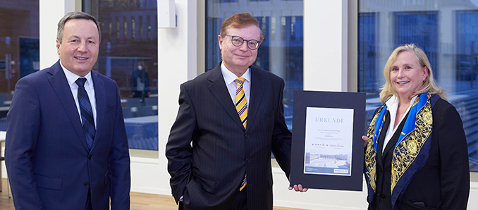 Auch die Bekanntheit der Hochschule Fulda will Dr. Schmidt mit der Vergabe des Forschungspreises weiter steigern. „Auf einer Tagung konnte ich feststellen, dass einige Kolleginnen und Kollegen nicht wussten, dass Fulda eine Hochschule hat“, berichtete er. „Die Stadt als Hochschulstandort bekannter zu machen, ist ein weiterer Grund, warum ich mich entschlossen habe, die Stiftung aufzulegen.“ „Wir freuen uns außerordentlich über diese großzügige Förderung durch Herrn Dr. Schmidt“, betonte Hochschulpräsident Professor Dr. Karim Khakzar, der symbolisch eine Urkunde entgegennahm. „Wir wollen die Forschung an der Hochschule Fulda weiter ausbauen. Das eigenständige Promotionsrecht, das wir seit fünf Jahren für forschungsstarke Fachrichtungen haben, ist dafür ein zentraler Baustein. Dabei unterstützt die „Dr.-Norbert-Schmidt-Stiftung“ künftig unsere Nachwuchswissenschaftlerinnen und Nachwuchswissenschaftler.“ Für die Hochschule Fulda sei der Forschungspreis daher eine hervorragende Gelegenheit, herausragende Leistungen zu honorieren und gleichzeitig auf wissenschaftliche Karrieremöglichkeiten aufmerksam zu machen.