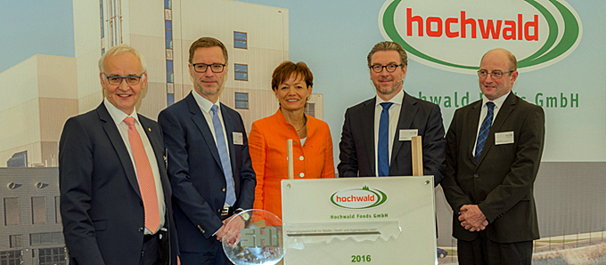 Aufsichtsratsvorsitzender der Hochwald Foods GmbH, Hans-Jürgen Sehn, Chief Financial Officer Detlef Latka, Ministerin für Bundes- und Europaangelegenheiten des Landes Hessen, Lucia Puttrich, Chief Operating Officer Karl Eismann und Aufsichtsratsvorsitzender der Hochwald Milch eG Anton Streit eröffnen feierlich die neue Produktion.