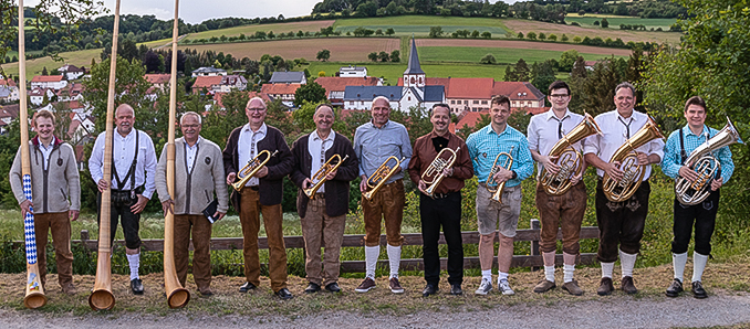 An diesem Wochenende waren auch wieder viele namhafte Gastmusiker mit von der Partie um den Gästen ein besonderes Klangerlebnis zu bieten, welches mit viel Beifall gewürdigt wurde. Als Gastmusiker waren Sascha Betzhold (Blankenau/Blankenauer Musikanten), Burkhard und Jannik Fleck (Istergiesel/MV Istergiesel) mit ihren Tenorhörnern, sowie Thomas Faust (Blankenau/Blankenauer Musikanten), Stefan Jost (Kleinlüder/Heimatklänge Giesel) und Peter Goldbach (Dipperz/MV Dipperz) mit ihren Flügelhörnern am „Hopperain“ und einem gigantischen Klangerlebnis zu hören. Mit vielen sorgfältig ausgesuchten Musikstücken wie beispielsweise das „Ave Maria“ nach der Melodie „Wenn ich ein Glöcklein wär“ von den Hergolshäuser Musikanten, sowie dem „Ännchen von Tharau“ und „Am Brunnen vor dem Tore“ glänzte das Ensemble auf Ihren Blechblasinstrumenten in vielstimmiger Weise. Die „Nüsttaler-Alphorn-Bläser“ Matthias und Philipp Flügel, sowie die „Verstärkung“ Markus Günther (Oberrode/MV Mittelrode) lieferten mit ihren 3 Alphörnern ebenfalls einen Mega-Sound der Extraklasse für alle angereisten Zuhörer ab. Die Rhöner Musiker waren bereits das dritte Mal mit von der Partie und verzauberten 3 stimmig mit ihren Bravour-Stücken die große Menschenmenge eindrucksvoll am Blankenauer Hopperain.