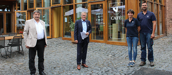 Corona, Perspektiven und die Digitalisierung: Wirtschaftsförderer Walter Dreßbach und Kreisbeigeordneter Winfried Ottmann hatten mit Myriam und Tobias Hecker im „Hotel & Café Gut Hühnerhof“ viel zu besprechen (v.l.).